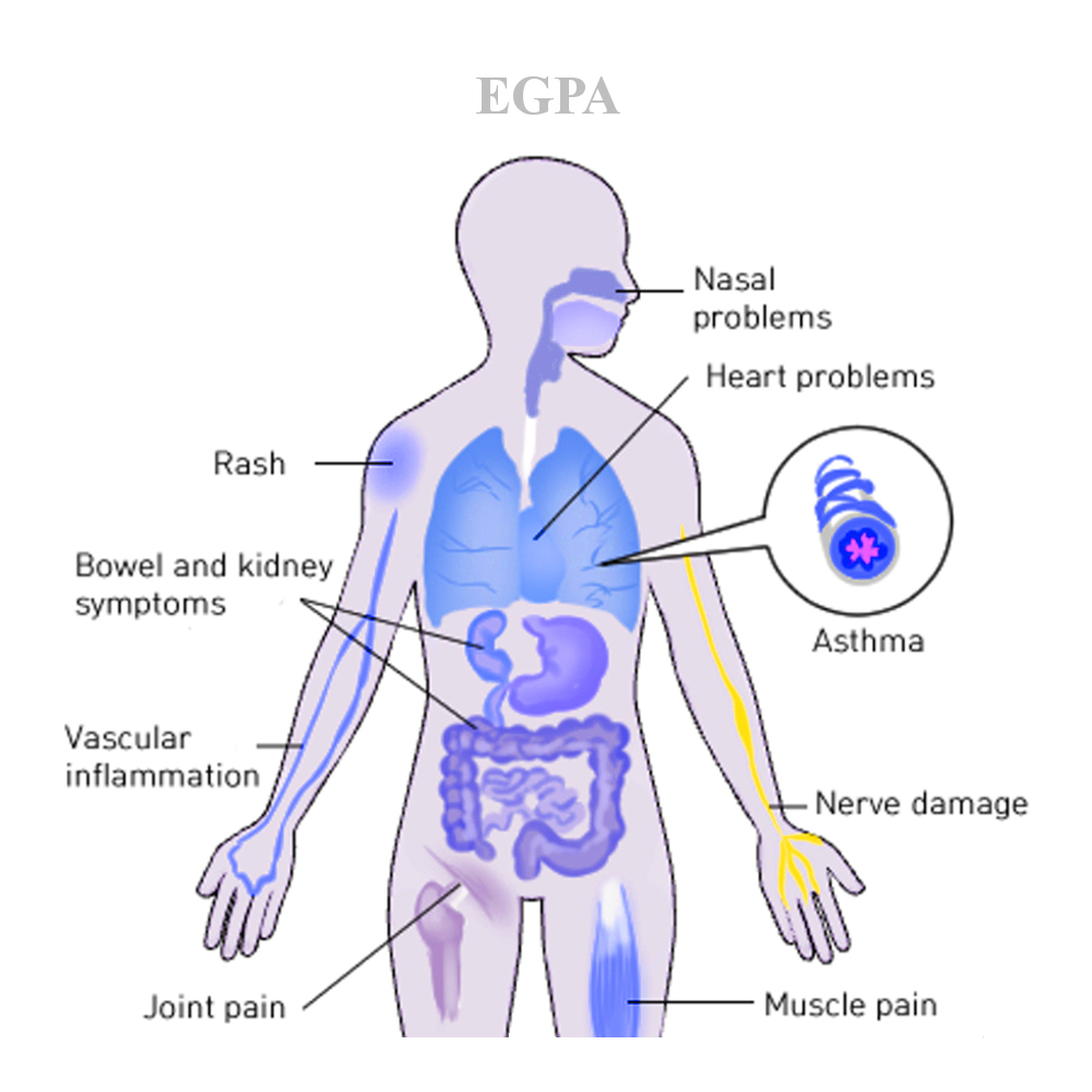 EGPA (Eosinofiele Granulomatose met Polyangiitis) is een ANCA geassocieerde vasculitis en wordt vaak voorafgegaan door een (jarenlange) fase met astma, neuspoliepen of veelvuldige ontstekingen van de bovenste luchtwegen. Opvallend is dat er vaak geen aantoonbare allergie is.