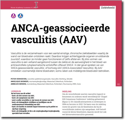 Dit artikel in Nurse Academy is een initiatief van de Vasculitis Stichting en speciaal geschreven om verpleegkundigen via een van hun eigen vakbladen uitgebreid te informeren over ANCA-vasculitis (GPA, MPA en EGPA)