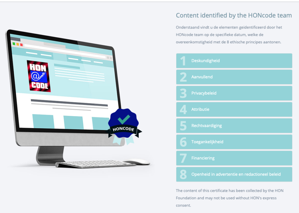 De HONcode certificering is een ethische standaard gericht op de manier van aanbieden van kwalitatieve gezondheidsinformatie. Het demonstreert het voornemen van een website om transparante informatie te publiceren. De transparantie van de website zal de bruikbaarheid en objectiviteit van de informatie verbeteren alsook de publicatie van de correcte gegevens.