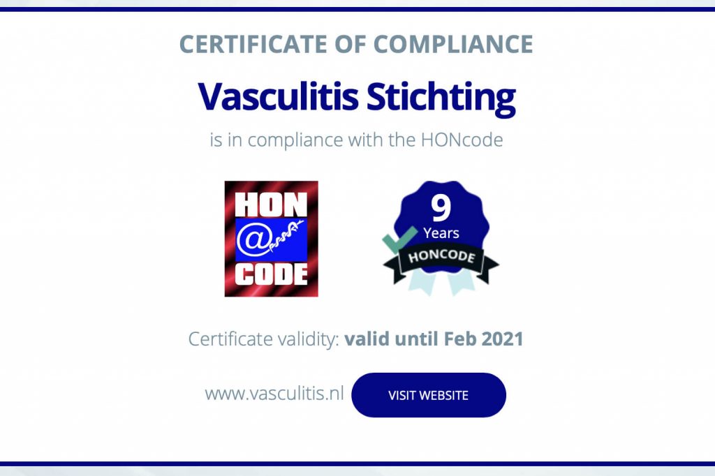 Als sinds 2011 mag de Vasculitis Stichting het zogenaamde HON code certificaat voeren, de verbintenis tot betrouwbare medische en gezondheidsinformatie op het internet: